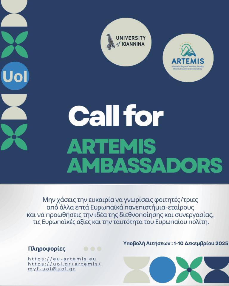 Το Πανεπιστήμιο Ιωαννίνων συμμετέχει στο Ευρωπαϊκό Πανεπιστήμιο ARTEMIS και σας προσκαλεί να υποβάλετε αίτηση για τη Δράση "Πρεσβευτές ARTEMIS" (ARTEMIS Ambassadors) για το ακαδημαϊκό έτος 2025–2026.