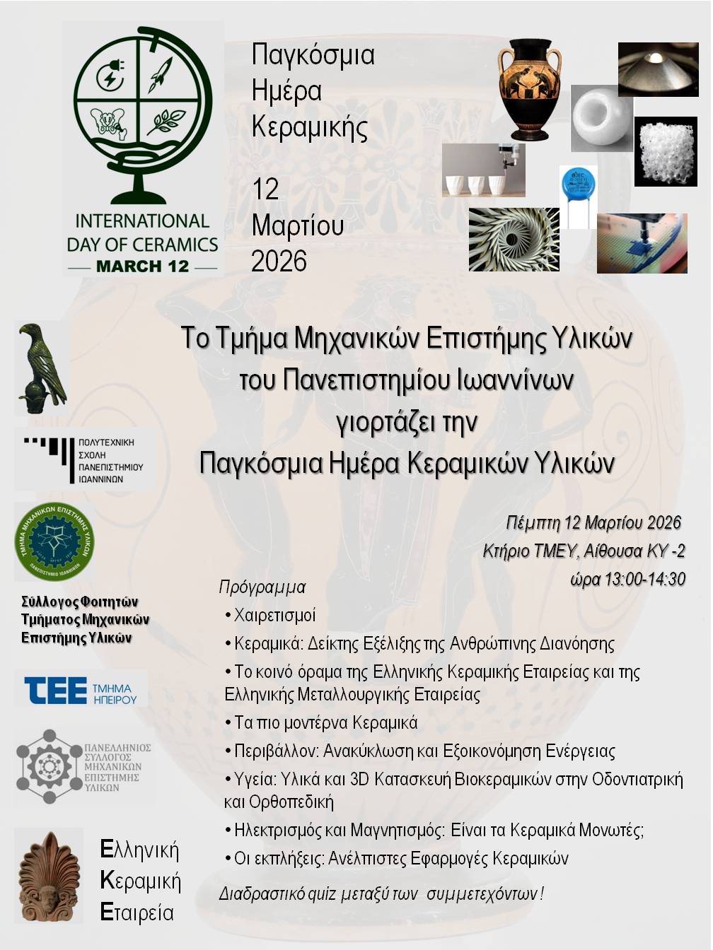 10 Μαρ. 2026Το ΤΜΕΥ, ως το μοναδικό Τμήμα Μηχανικών Επιστήμης Υλικών στη χώρα, διοργανώνει εκδήλωση για να γιορτάσει την Παγκόσμια Ημέρα Κεραμικών, την Πέμπτη 12 Μαρτίου 2026, στην αίθουσα ΚΥ2 μεταξύ 13:00 και 14:30.