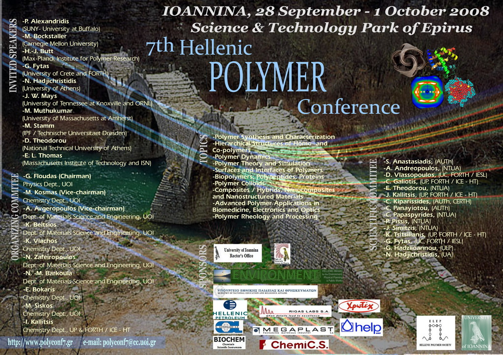 On behalf of the Organizing Committee I would like to invite you to the 7th Hellenic Polymer Conference, which will be held at Ioannina by the Departments of Physics, Chemistry and Materials Science & Engineering, at